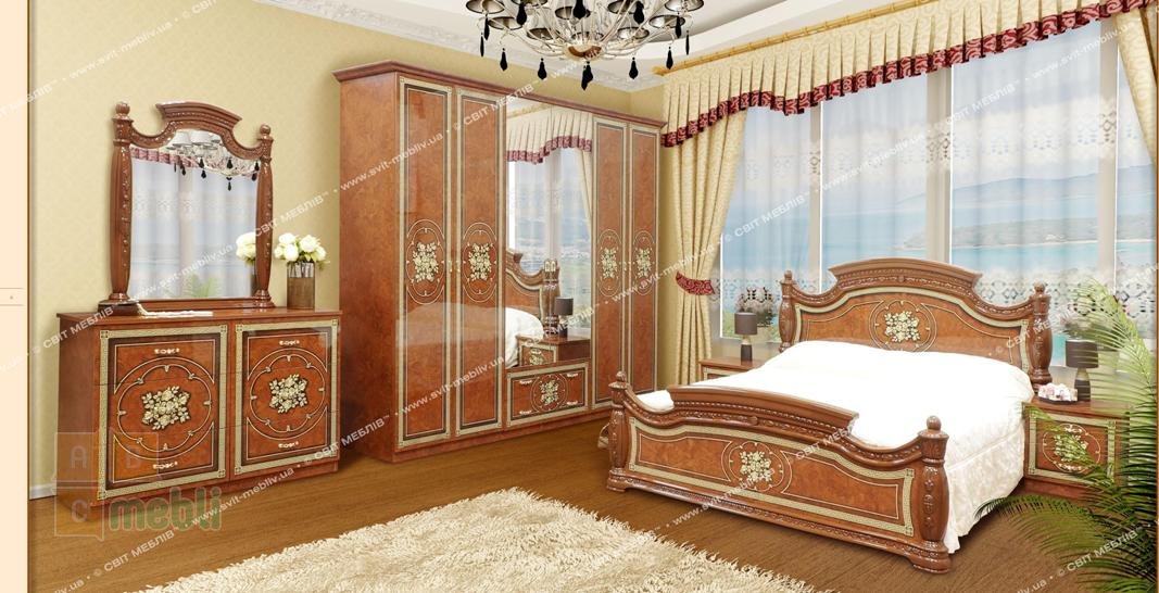 Спальня Жасмин Світ-Меблів-спальня которая изготовлена в классическом стиле и напоминает спальню дворцовых покоев и исторический стиль. Спальня Жасмин Світ-Меблів-это просторная, удобная спальня главное место в которой занимает кровать которая изготовлена в стиле современной классики. Спальня Жасмин Світ-Меблів-это плавные лини, массивность и спокойный классический цвет (орех).