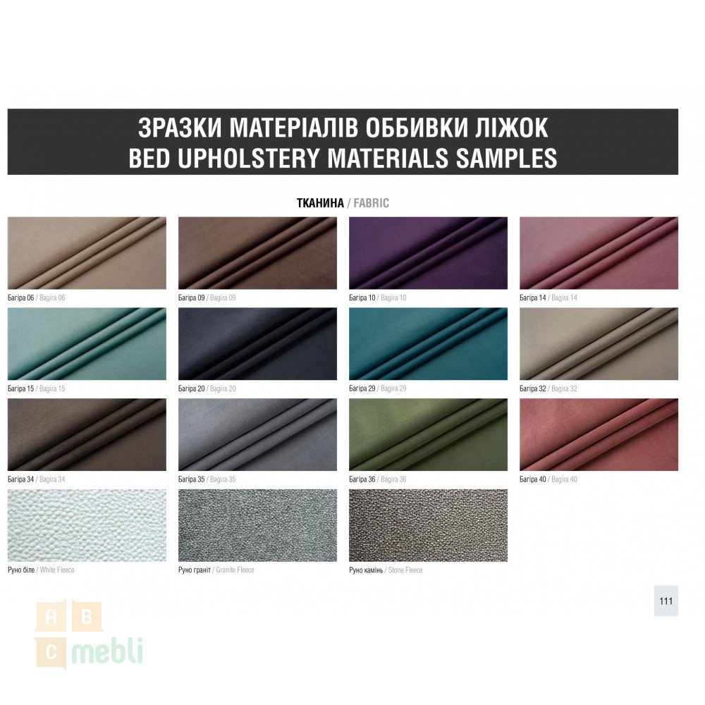 Варіанти тканини ліжка: Руно біле / Руно граніт / Руно камінь / Багіра 29 / Багіра 09 / Багіра 35 / Багіра 32
